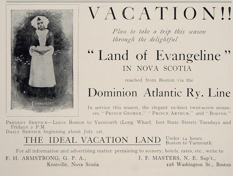 This is an original 1902 black and white print ad for travel to Nova Scotia "Land of Evangeline" reached from Boston via the Dominion Atlantic Railway Line. F. H. Armstrong, General Passenger Agent; J. F. Masters, N. E. Sup't.