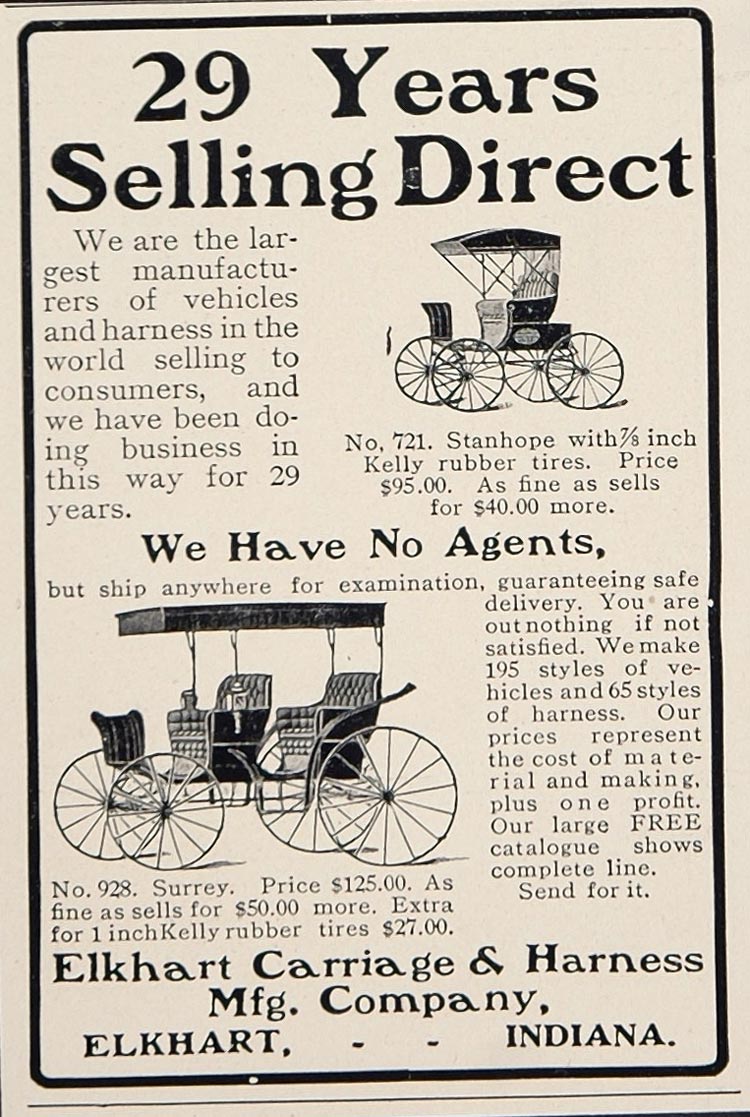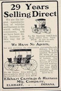 This is an original 1902 black and white print ad for carriages from the Elkhart Carriage & Harness Mfg. Company, Elkhart, Indiana. Illustrated here are the No. 721 Stanhope Carriage ($95.00) and the No. 928 Surrey ($125.00).