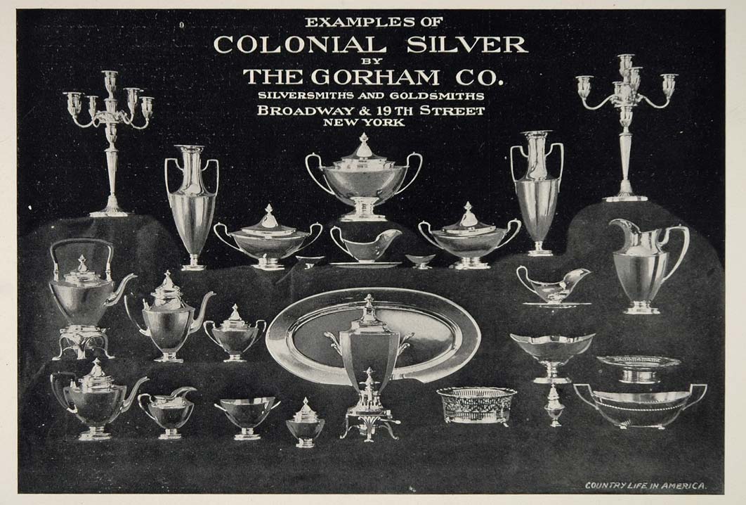 This is an original 1902 black and white print ad for Colonial Silver items from The Gorham Company, Broadway and Nineteenth St., NYC.