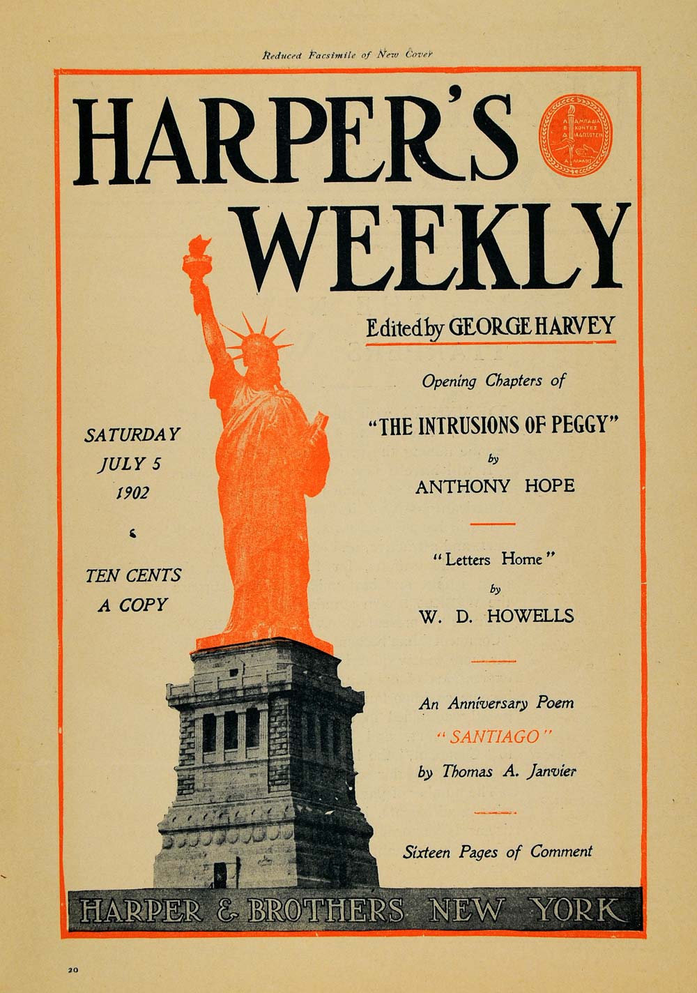 This is an original 1902 color print ad for Harper's Weekly, edited by George Harvey with opening chapters of "The Intrusions of Peggy" by Anthony Hope. It also features "Letters Home" by W. D. Howells and an anniversary poem called "Santiago" by Thomas A. Janvier.