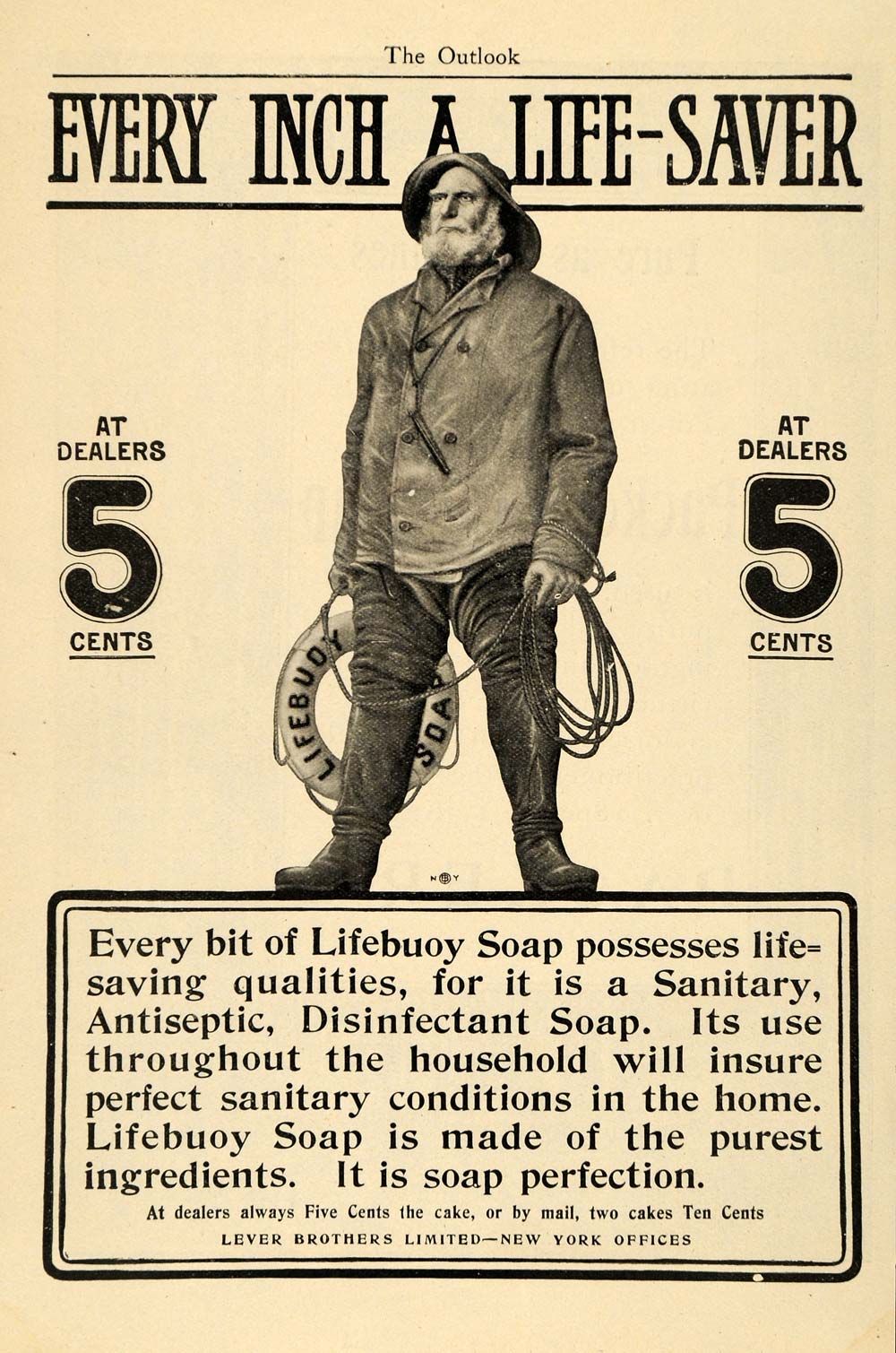 Keywords specific to this image: sailor, buoy, pricing, disinfectant, clean, antiseptic, wash, raincoat, captain, seaman, life preserver Vintage Advertising