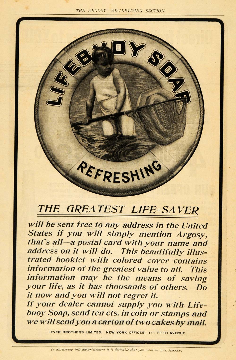 This is an original 1902 black and white print ad for the Lifebuoy Soap from Lever Brothers Limited located at 111 Fifth Avenue, New York.
