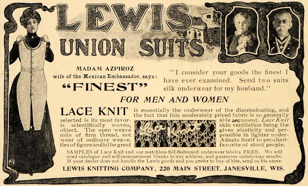 This is an original 1902 black and white print ad for Lewis Union Suits for men and women from the Lewis Knitting Company, 220 Main Street, Janesville, Wisconsin, with a testimonial from Madam Azpiroz, the wife of the Mexican Ambassador.