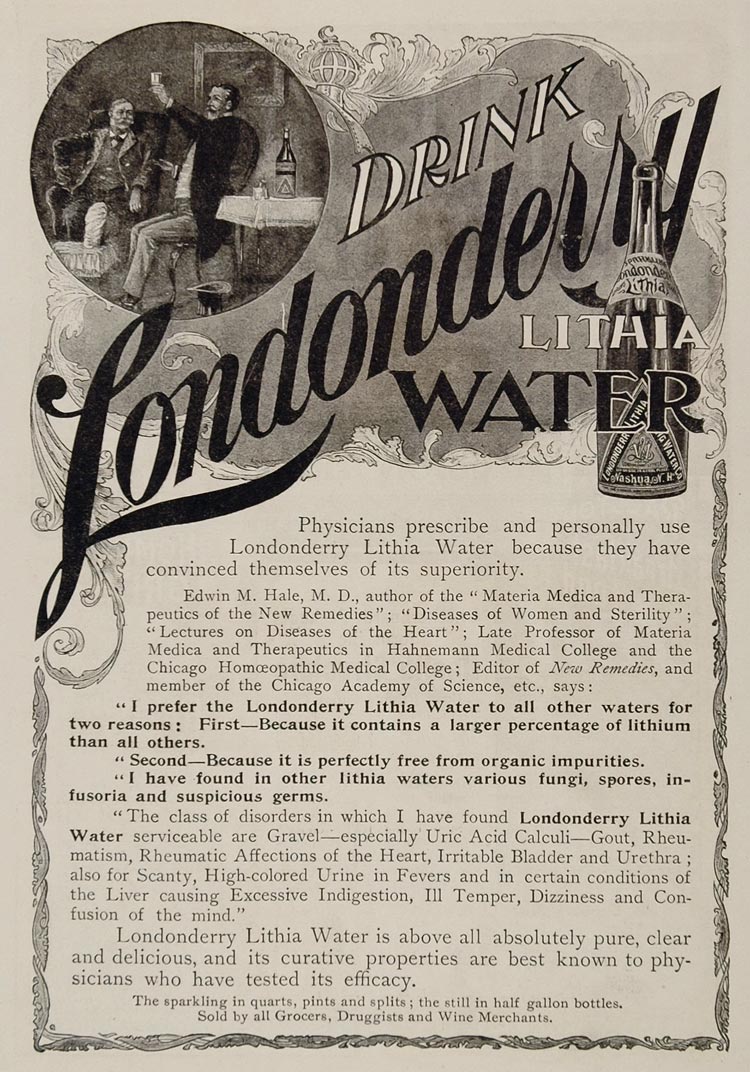 This is an original 1902 black and white print ad for Londonderry Lithia Water from the Londonderry Lithia Spring Water, Co., Nashua, New Hampshire with a testimonial from Edwin M. Hale, M.D.