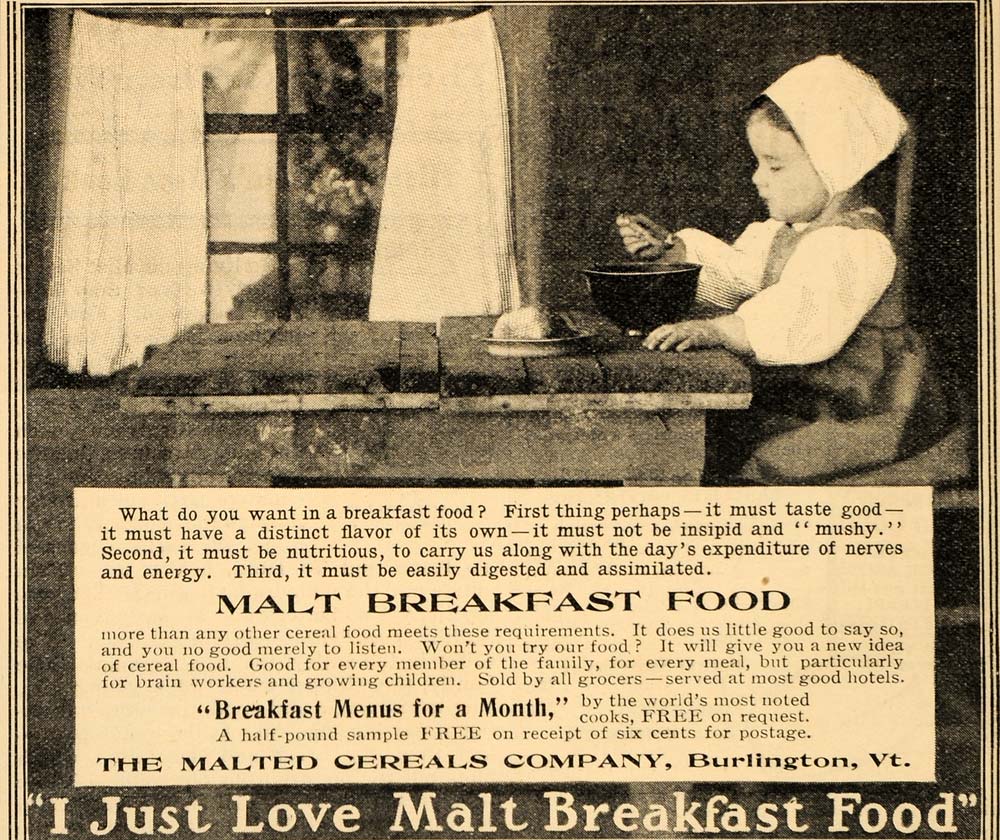 This is an original 1902 black and white print ad for Malt Breakfast Food by The Malted Cereals Company located in Burlington, Vermont.