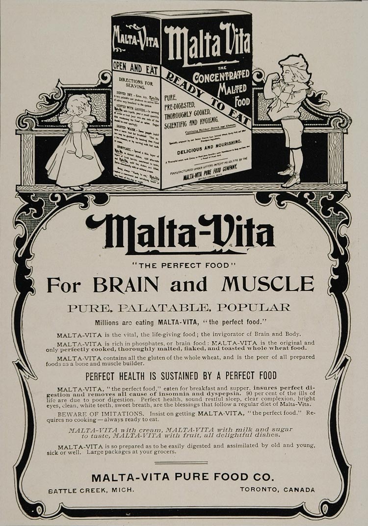 This is an original 1902 black and white print ad for Malta-Vita Whole Wheat Health Food from the Malta-Vita Pure Food Co., Battle Creek, Michigan.