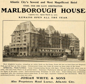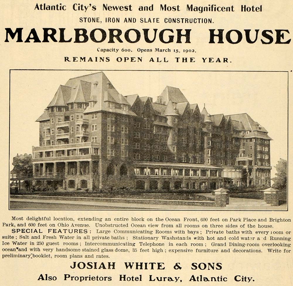 This is an original 1902 black and white print ad for the Marlborough House of Atlantic City. The hotel offered hot and cold sea water in all baths, telephones in all rooms, and a ladies' hairdresser service.
