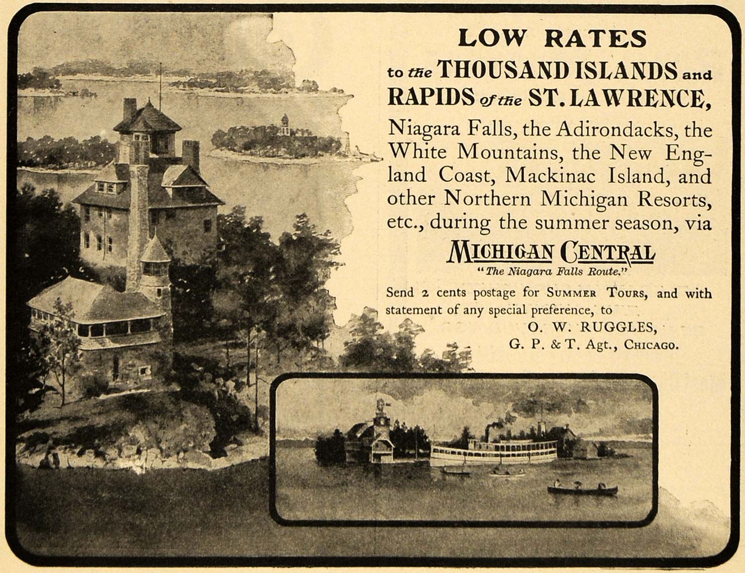 Keywords specific to this image: Thousand Islands, Ship, Rapids of the St. Lawrence, O. W. Ruggles, Northern Michigan, Mackinaw Island, Mackinac, Adirondacks, White Mountains, New England Coast Vintage Advertising