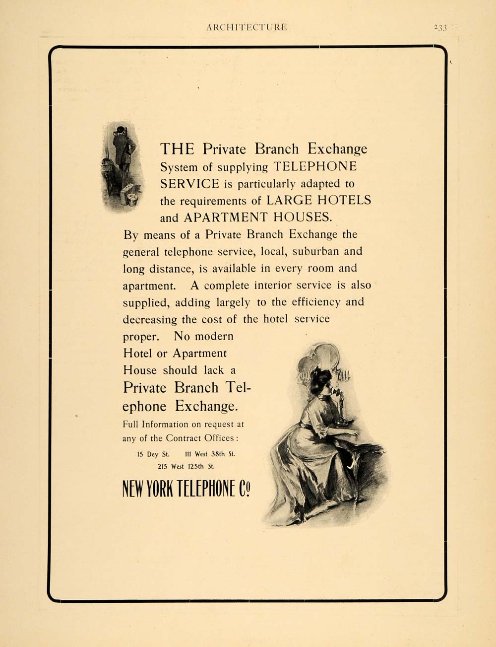 This is an original 1902 black and white print ad promoting the Private Branch Exchange System of supplying Telephone Service for large hotels and apartment houses from New York Telephone Company.