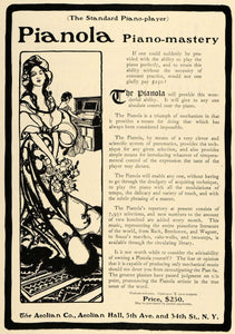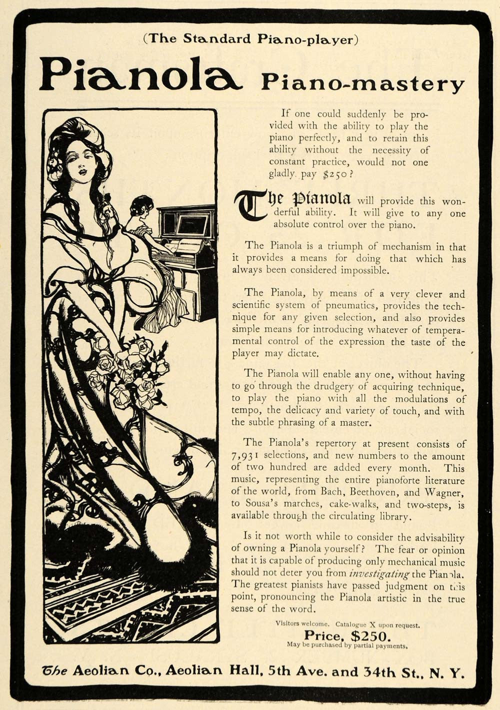 This is an original 1902 black and white print ad for the Pianola from the Aeolian Company. The ad writes, "The Pianola will enable any one, without having to go through the drudgery of acquiring technique, to play the piano with all the modulations of tempo, the delicacy and variety of touch, and with the subtle phrasing of a master".