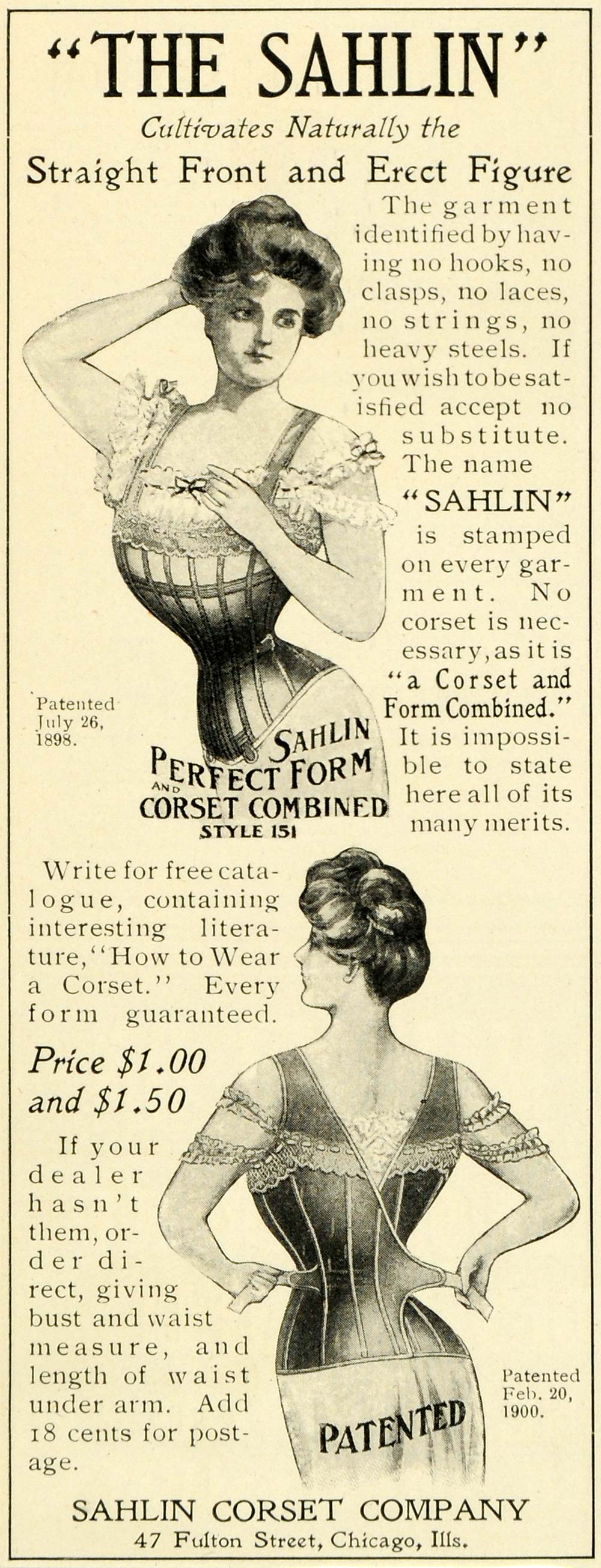 This is a small original 1902 black and white print ad for "The Sahlin" corset, a product by the Sahlin Corset Company, located at 47 Fulton Street in Chicago.