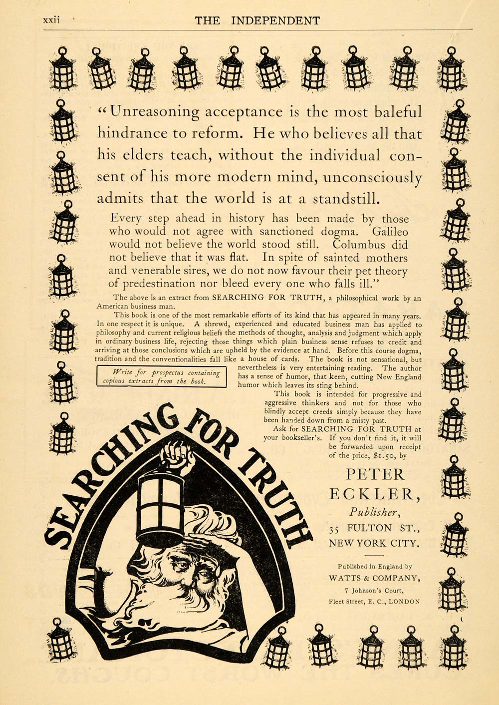 This is an original 1902 black and white print ad for the philosophical work "Searching For Truth," published by Peter Eckler, located at 35 Fulton Street in New York City.