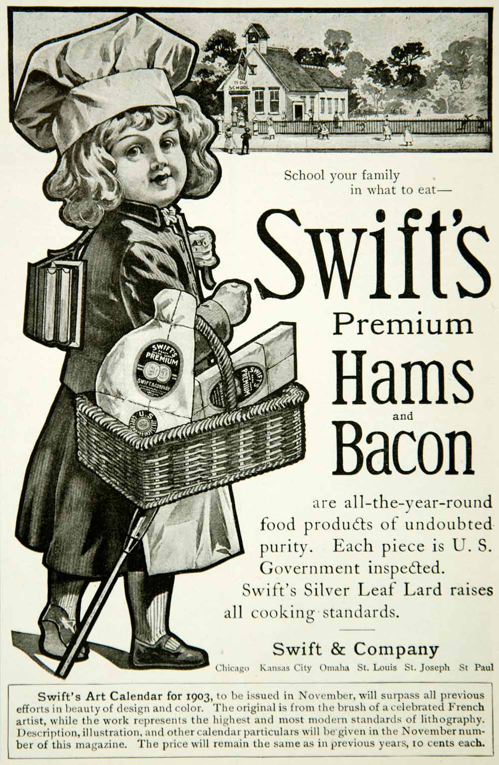 This is an original 1902 black and white print ad for Swift's Premium Hams and Bacon from Swift and Company.
