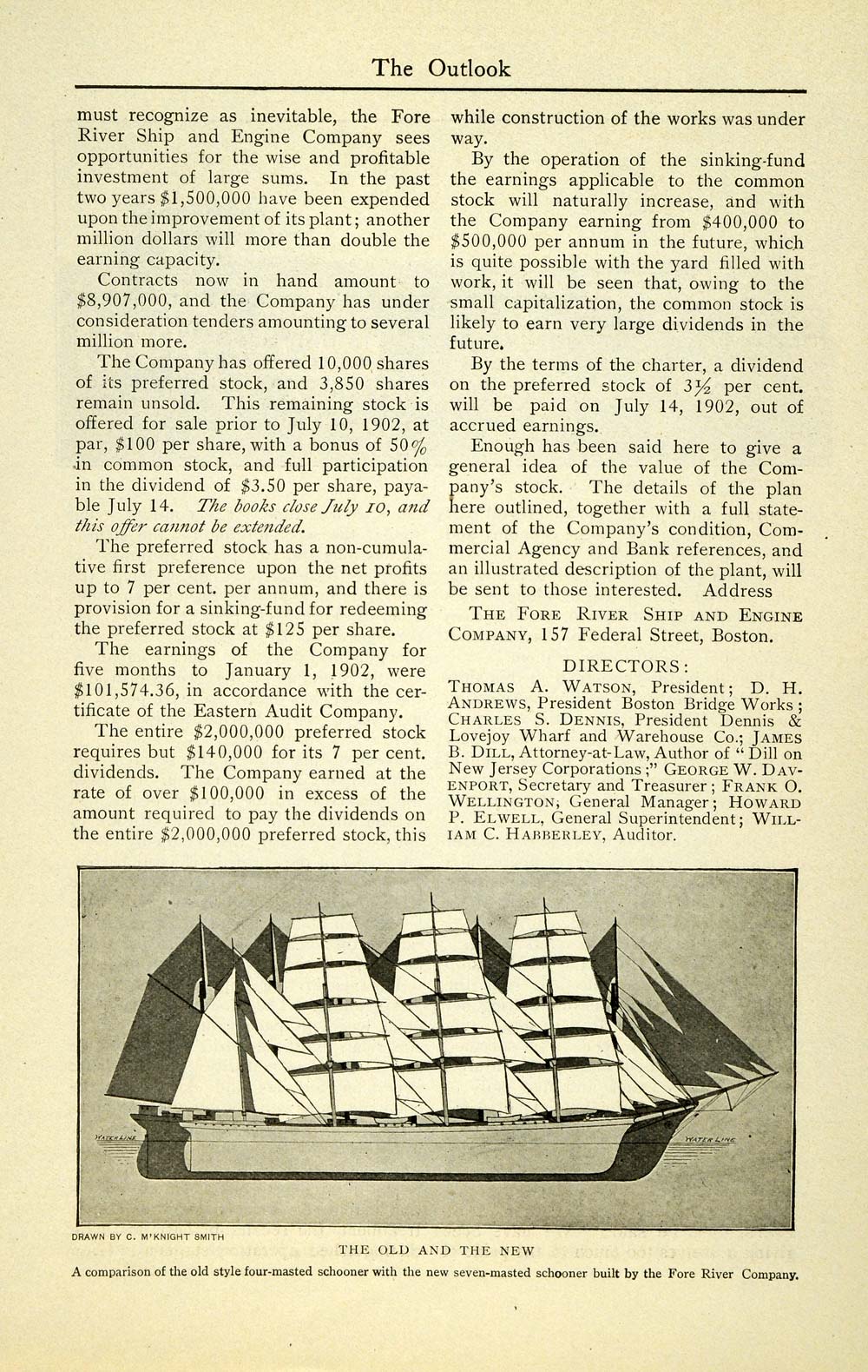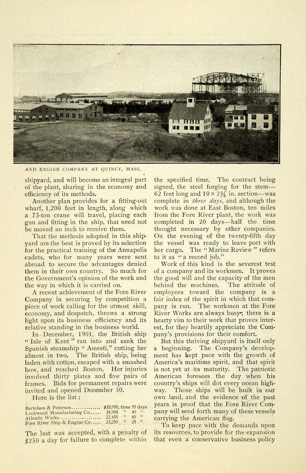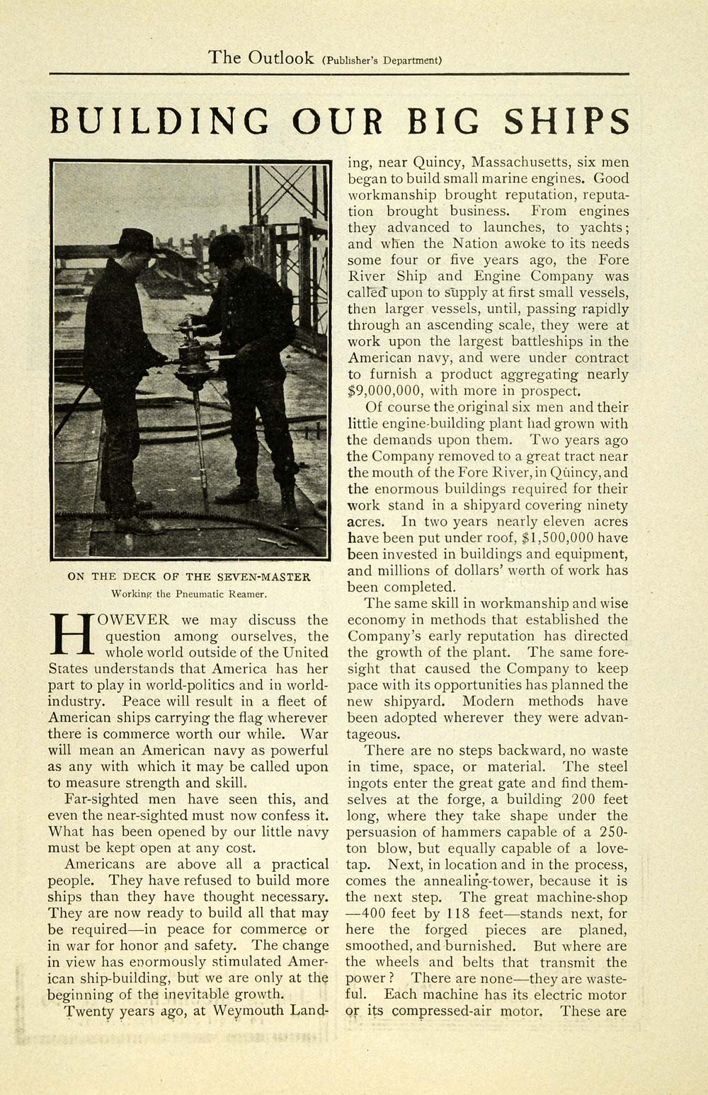 This is an original 1902 four-page article (two double sided pages) by The Fore River Ship and Engine Company, located at 157 Federal Street in Boston, Massachusetts. This article discusses shipbuilding, as well as noteworthy and historic ships. Please see additional images.