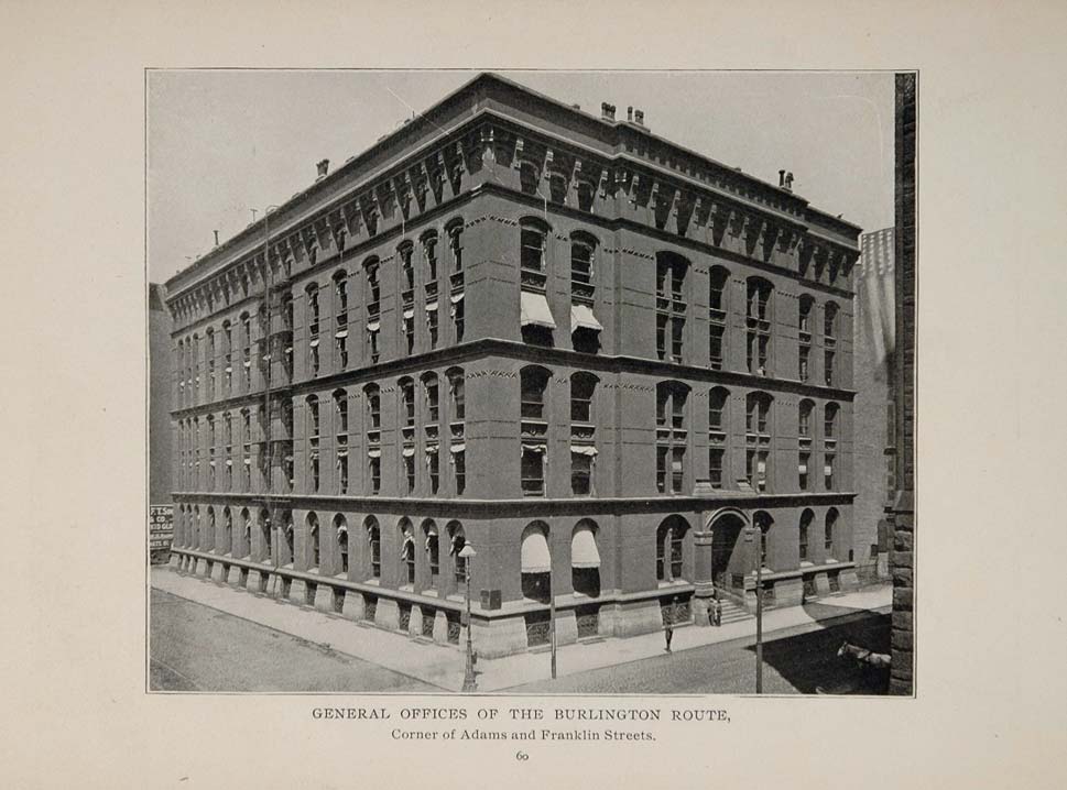 General Offices of the Burlington Route, Chicago. Located on the corner of Adams and Franklin Streets. Please note that the actual image measures approx. 4 x 5 inches.