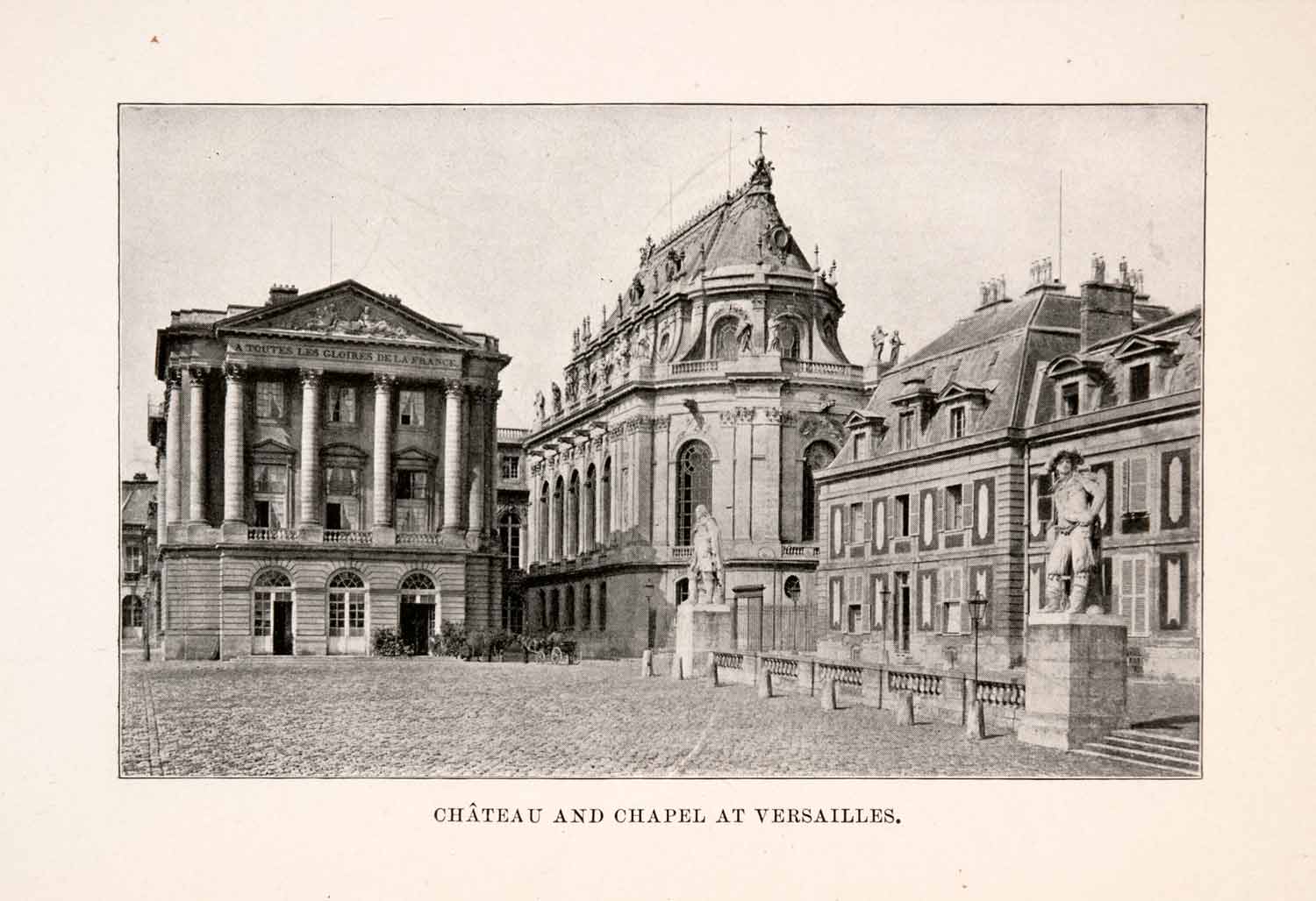 This is an original 1902 black and white halftone print of the Château and Chapel at Versailles. Versailles was the center of political power in France when Louis XIV moved from Paris until they had to move back during the French Revolution. Versailles is not only a building but a symbol of absolute monarchy during the Ancien Regime.