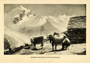 This is an original 1902 black and white halftone print of a man milking a cow in the summer pasture somewhere in the mountains in Switzerland.