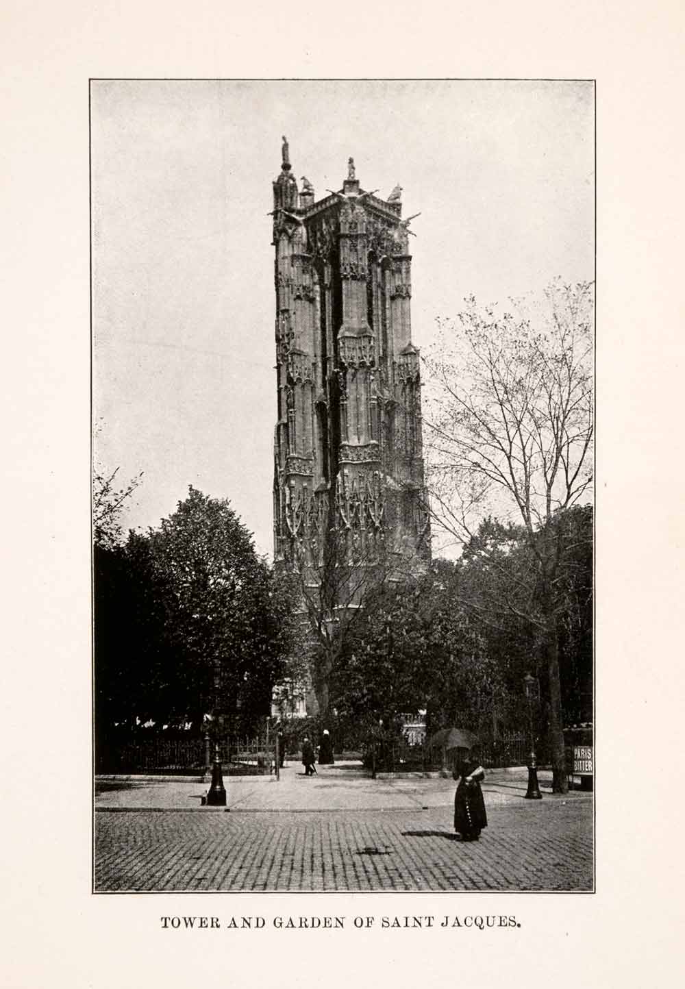 This is an original 1902 black and white halftone print of the Tower of Saint Jacques in Paris. This monument is all that remains of the former 16th century church of Saint-Jacques-de-la-Boucherie which was leveled shortly after the French Revolution.