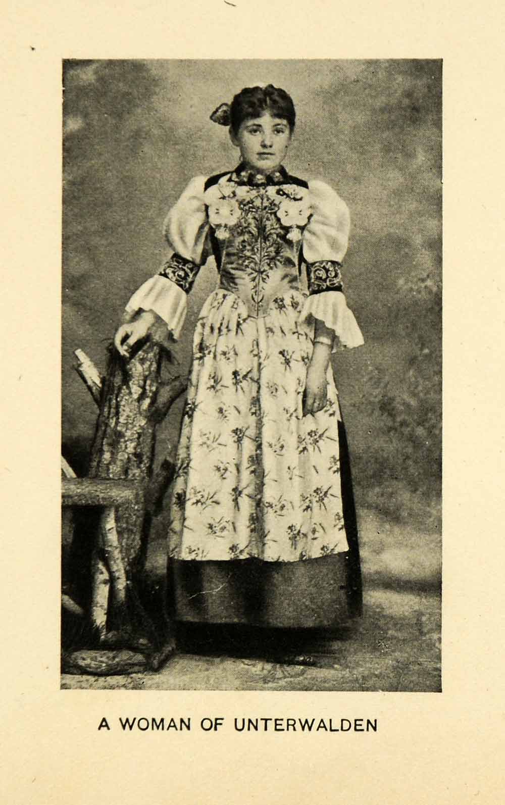 This is an original 1902 black and white halftone print of a woman in the traditional dress of the Unterwalden, Switzerland. Unterwalden is the old name for two half-cantons now named Obwalden and Nidwalden.