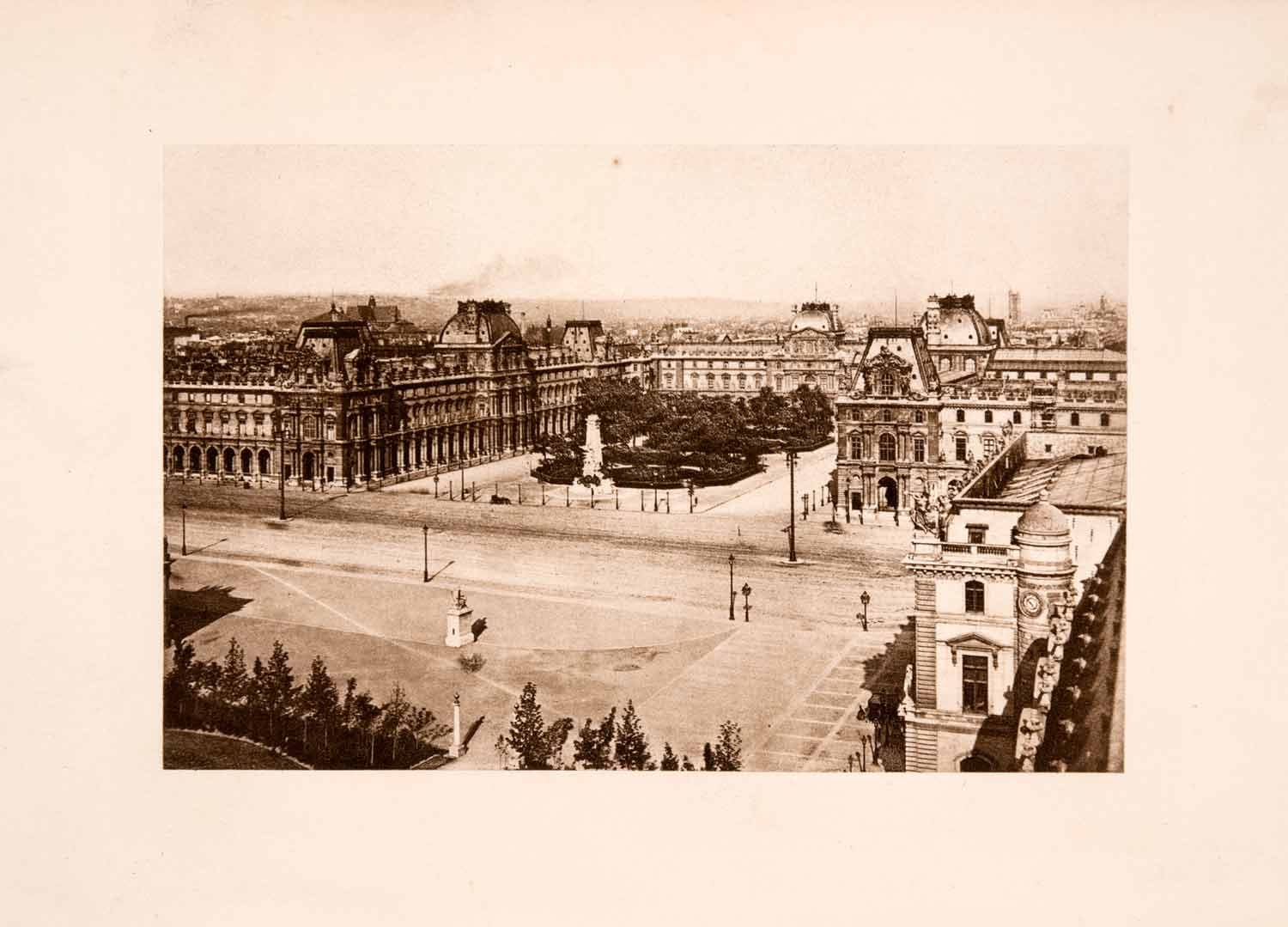 This is an original 1902 sepia photogravure of the Palace of the Louvre with the Ministry of Finance on the left and art galleries on the right and in the center in Paris, France.