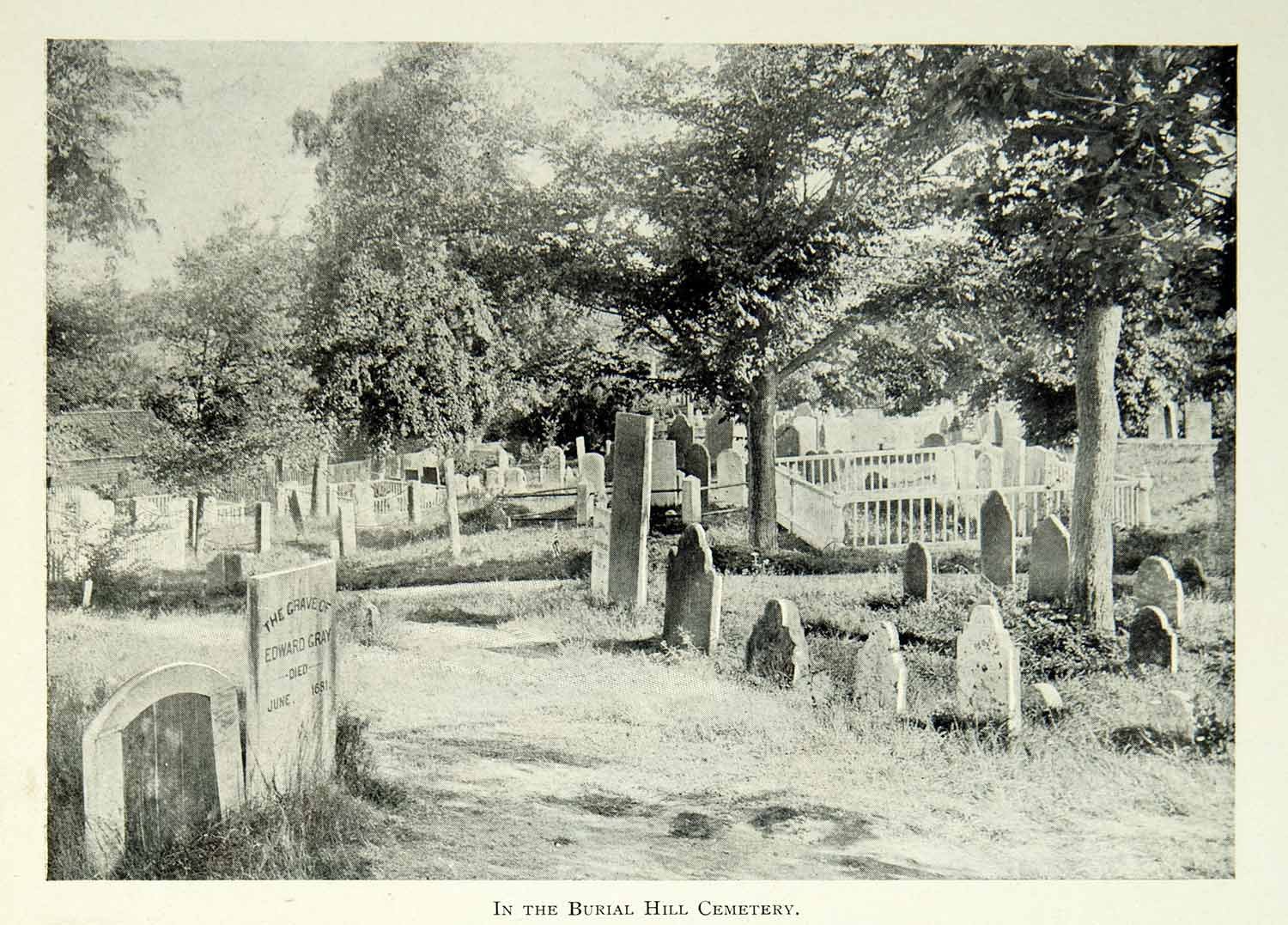 This is an original 1902 black and white halftone print of Burial Hill Cemetery in Plymouth, Massachusetts, the burial site of several Pilgrims.