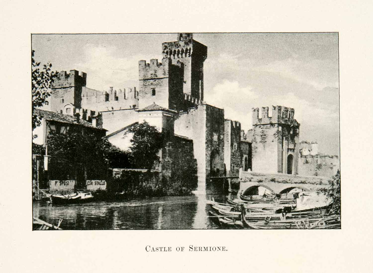 This is an original 1902 black and white halftone print of Castle of Sirmione also called the