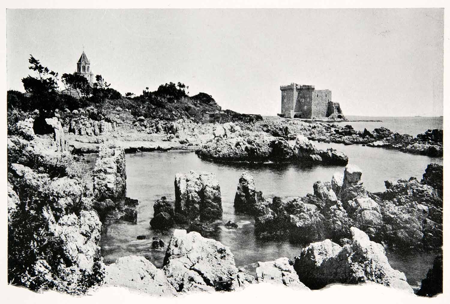 This is an original 1902 black and white halftone print of Château St. Honorat on the coast of Cannes in the French Riviera. These ruins, and the rest of the interior of the island of St. Honorat are home to the Cistercian monastic order that once owned most of Cannes.