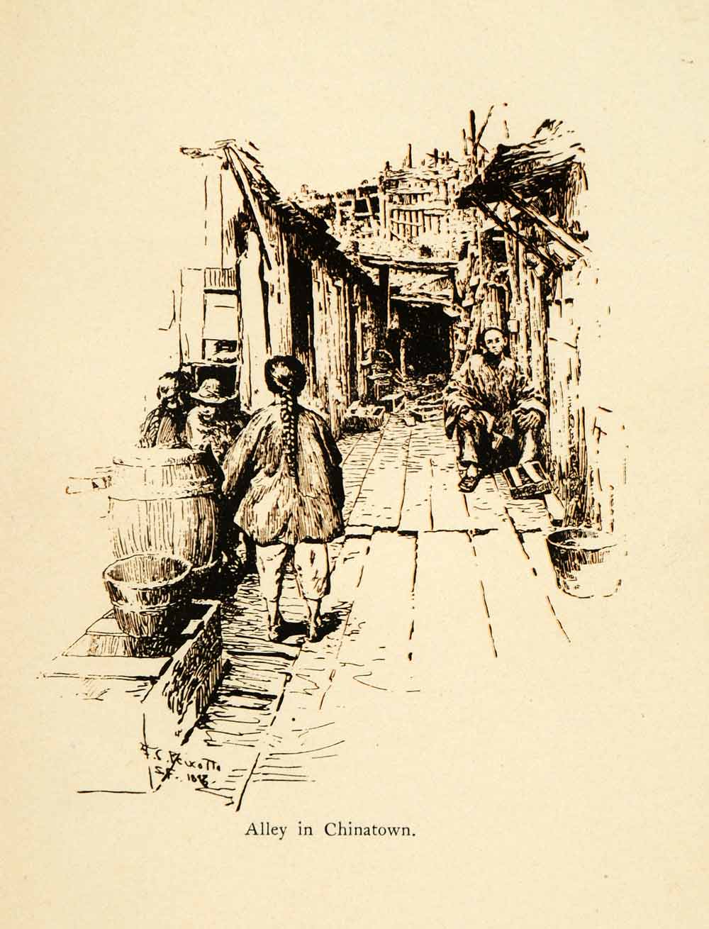 This is an original 1902 sepia halftone print of several people in an alley in Chinatown in San Francisco, California. This chinatown is the largest Chinese community outside of Asia and was established in 1848.