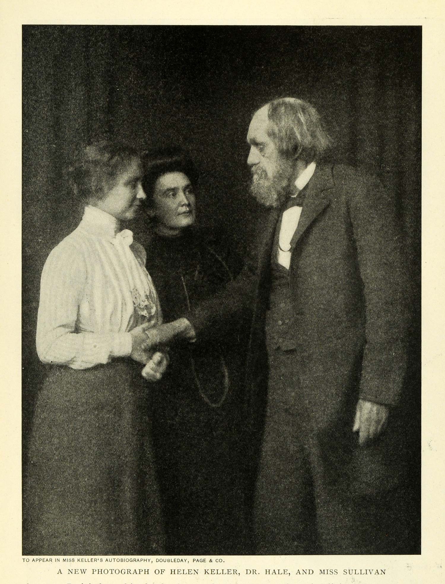 This is an original 1902 halftone print of a portrait of Helen Keller with Dr. Hale and Keller's teacher, Miss Anna Sullivan.