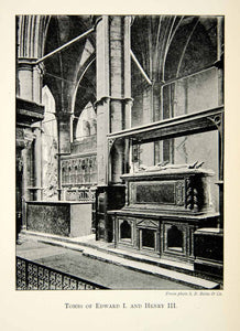 This is an original 1902 black and white halftone print of the tombs of Edward I and Henry III which are located in the Collegiate Church of St Peter at Westminster. It is also known as Westminster Abbey and is located in the City of Westminster in London, England. This church is mainly in the Gothic style and construction on it was begun in 1080.