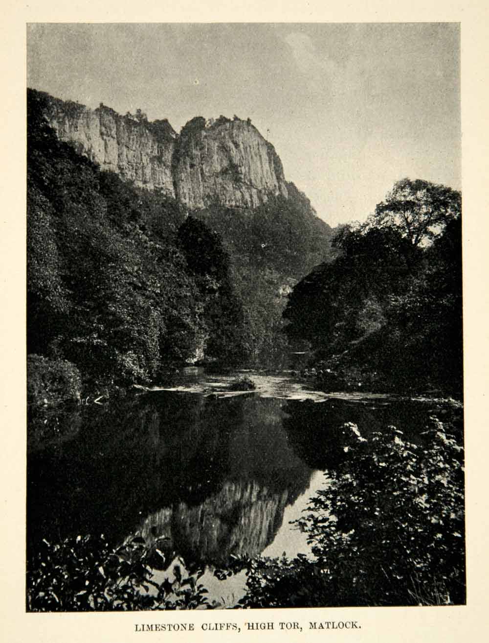 This is an original 1902 black and white halftone print of High Tor and Matlock which are limestone cliffs in England.
