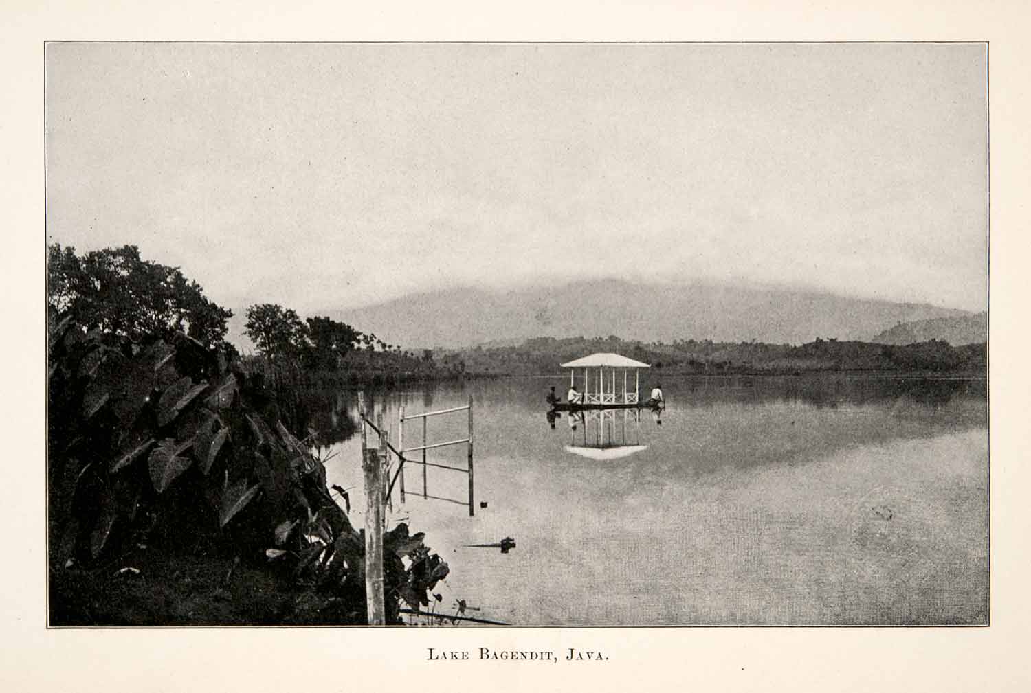 This is an original 1902 black and white halftone print of Lake Bagendit on the island of Java in Indonesia.
