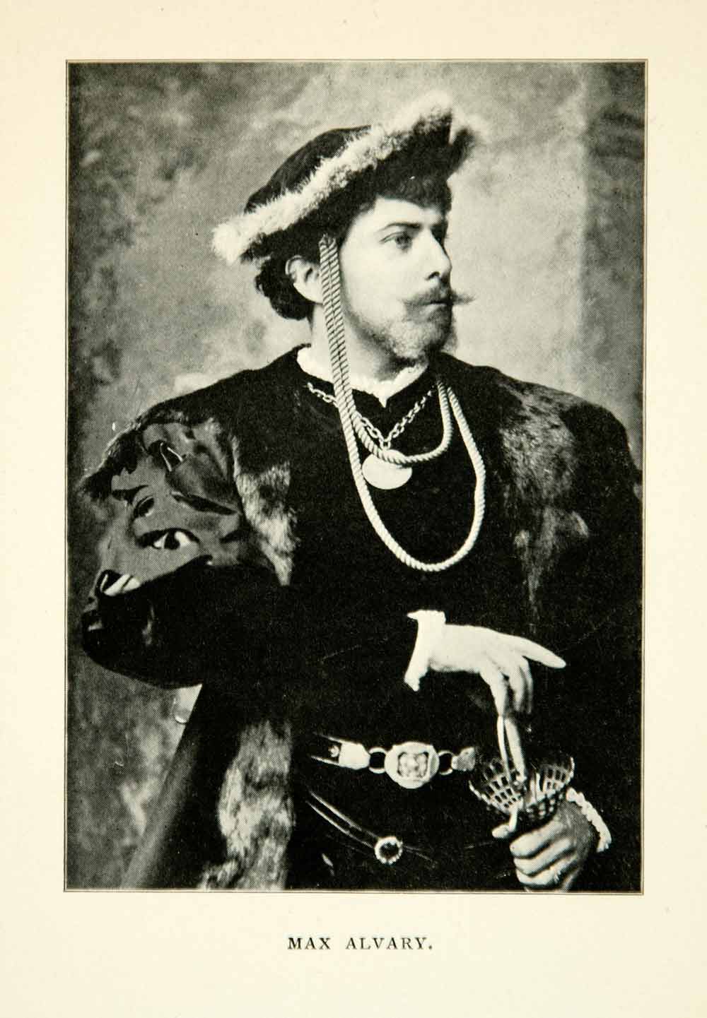 This is an original 1902 black and white halftone print of a portrait of German opera singer, Max Alvary (Maximilian Achenbach) dressed in stage costume during the Victorian era.