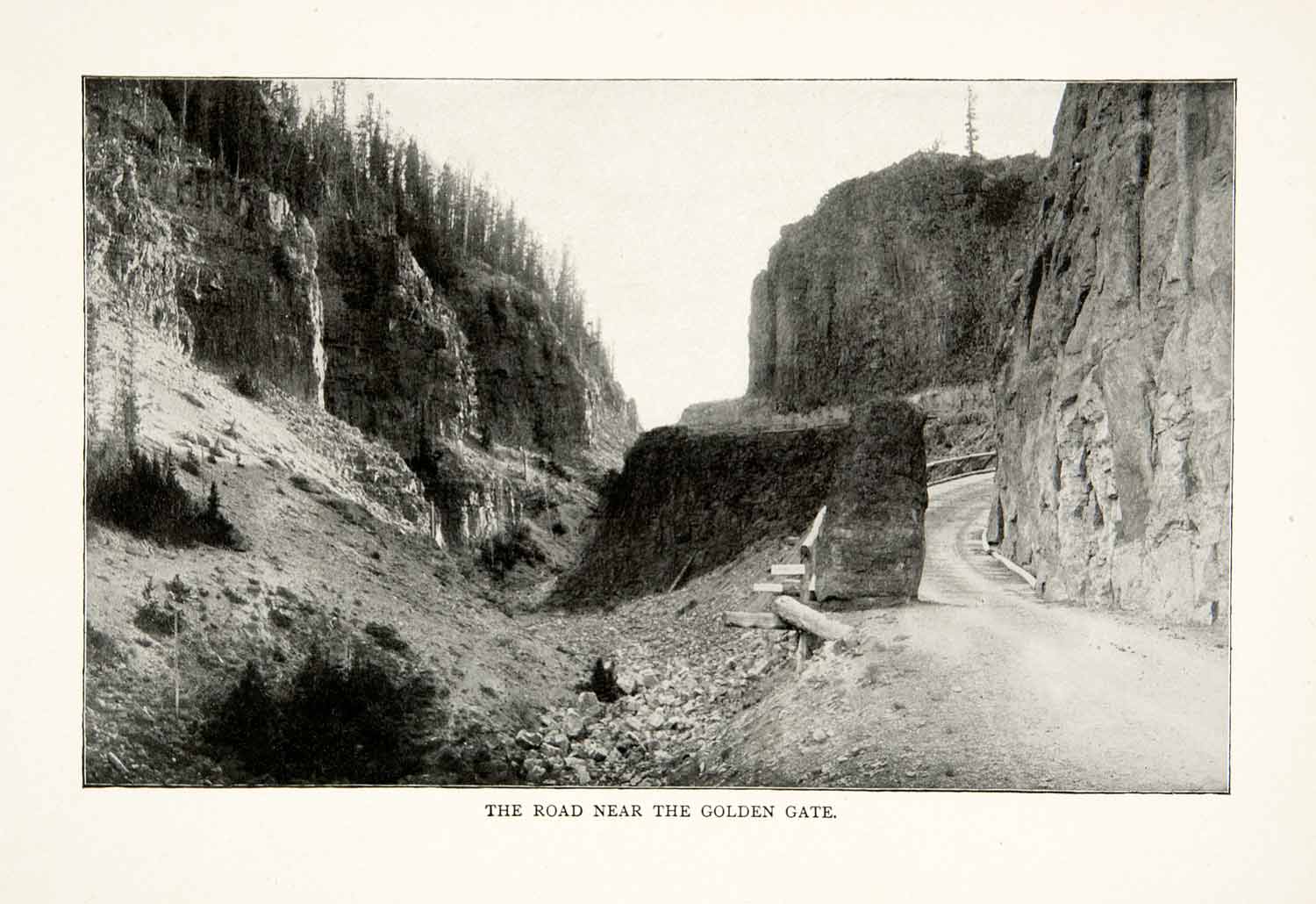 This is an original 1902 black and white halftone print of a road near the Golden Gate Canyon in Yellowstone National Park.