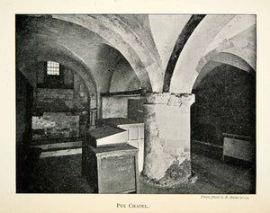 This is an original 1902 black and white halftone print of the Pyx Chapel or Chamber which is located in the Collegiate Church of St Peter at Westminster. It is also known as Westminster Abbey and is located in the City of Westminster in London, England. This church is mainly in the Gothic style and construction on it was begun in 1080. The Pyx Chamber was where the Pyx was stored. A Pyx is a container used to transport the consecrated host.
