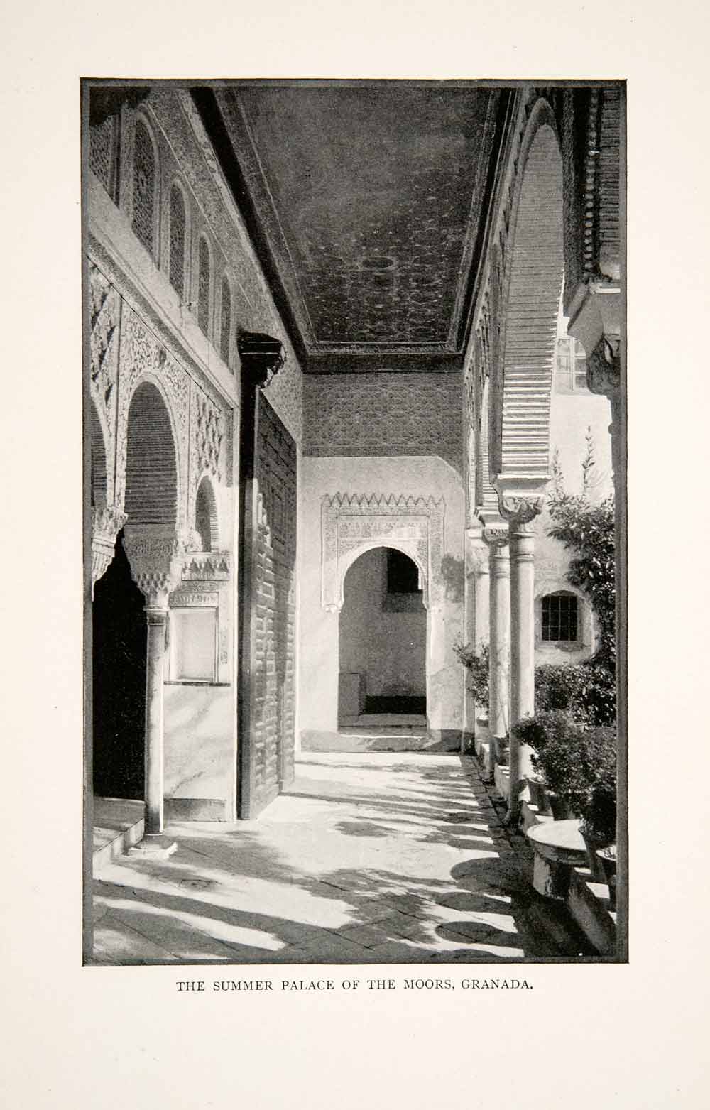 This is an original 1902 black and white halftone print of the summer palace of the Moors in Granada, Spain.