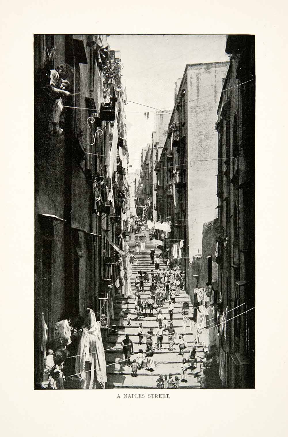 This is an original 1902 black and white halftone print of a busy tiered street in Naples, Italy.