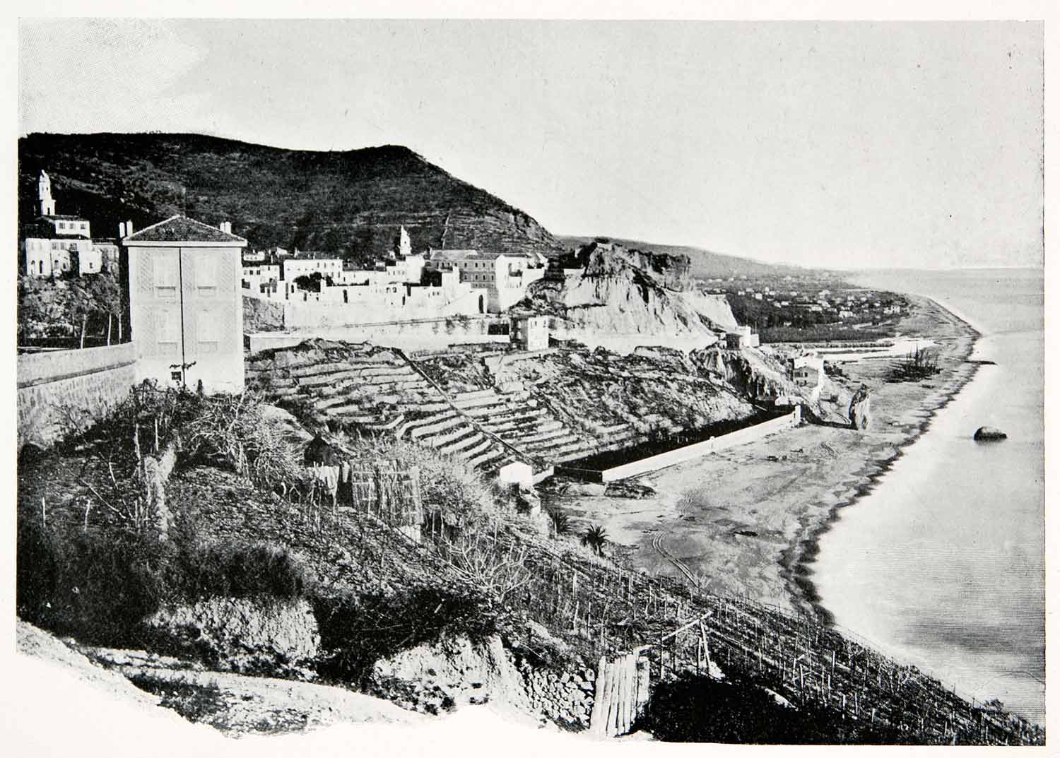 This is an original 1902 black and white halftone print of the seaport of Ventimiglia on the Ligurian coast of the Italian Riviera in the Gulf of Genoa.