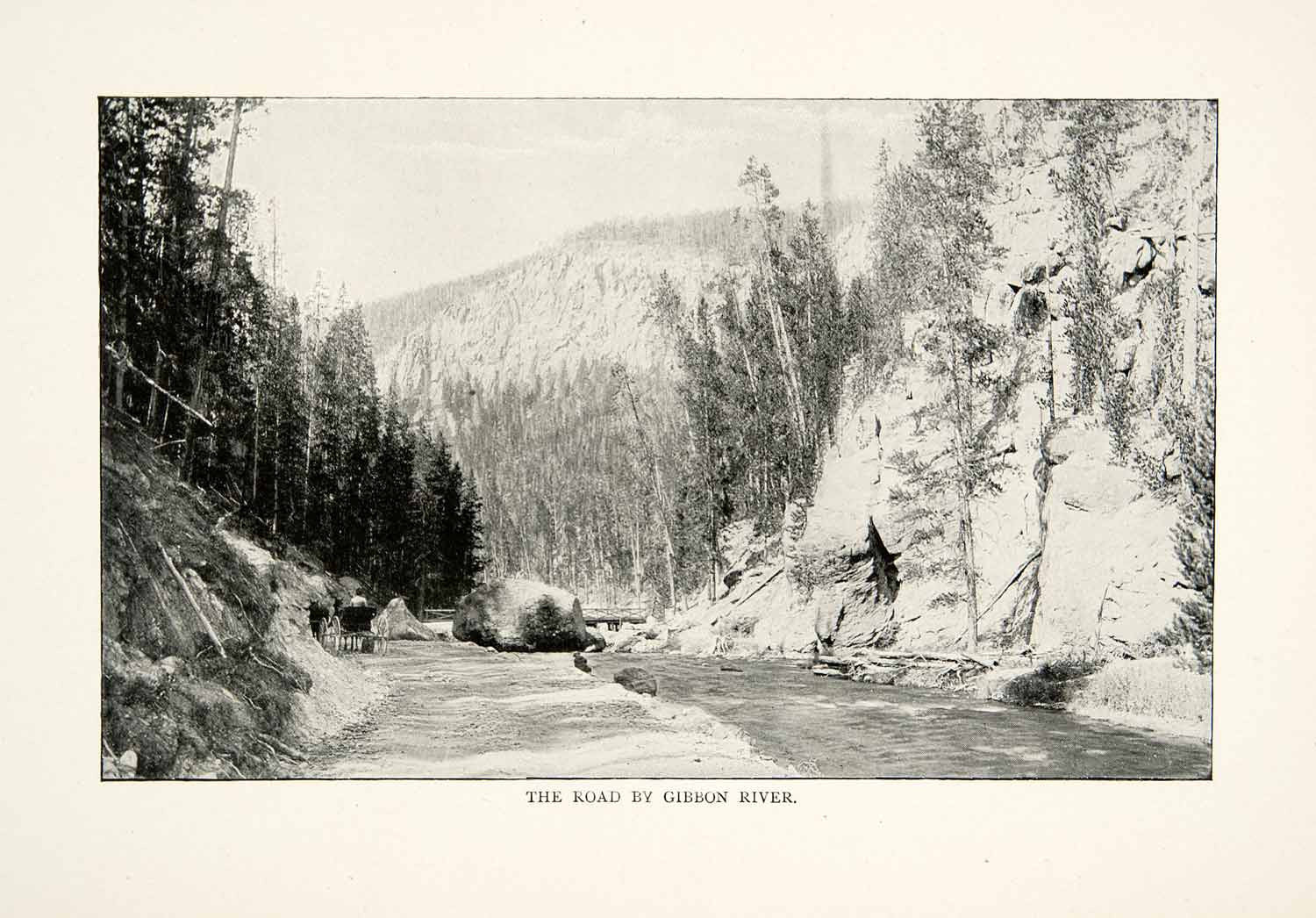 This is an original 1902 black and white halftone print of a road in Yellowstone National Park that runs along the Gibbon River (not pictured).