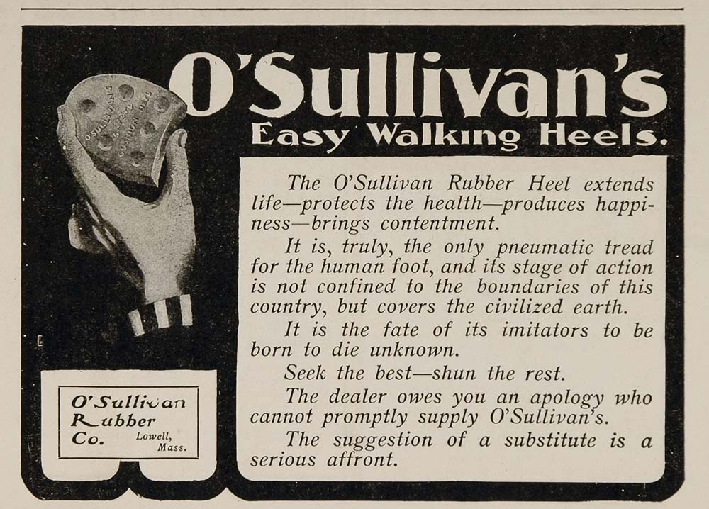 This is an original 1902 black and white print ad for O'Sullivan's Easy Walking Rubber Heels from the O'Sullivan Rubber Co., Lowell, Mass.