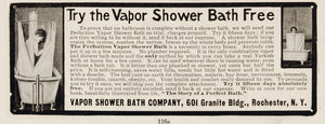 This is an original 1902 black and white ad for the Perfection Vapor Shower Bath, from the Vapor Shower Bath Co., 601 Granite Building, Rochester, New York.