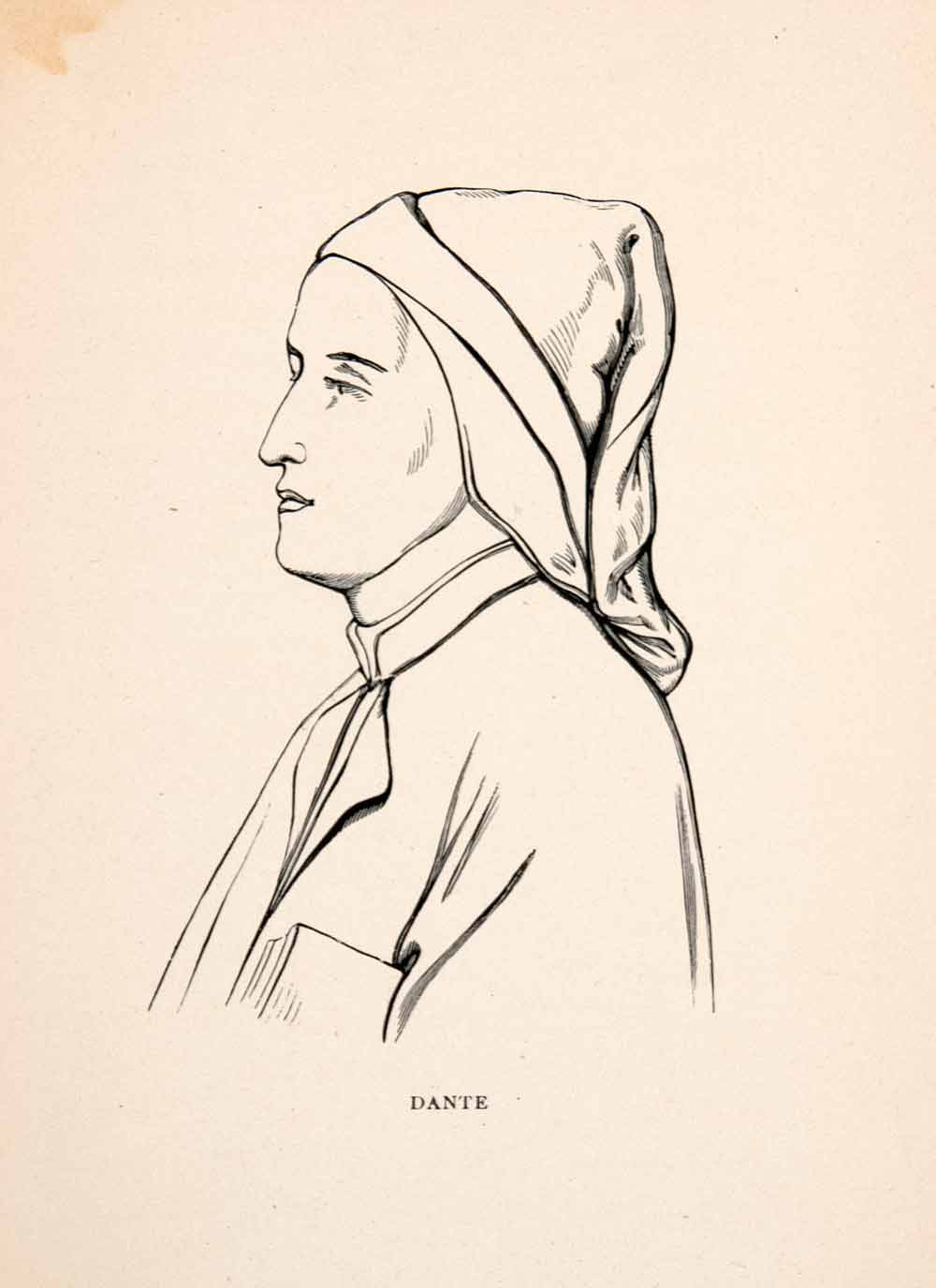 This is an original 1902 black and white wood engraving of "Dante," an Italian poet and writer.