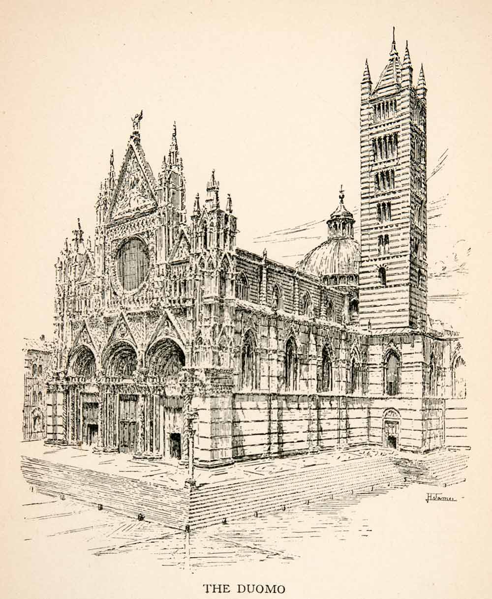 This is an original 1902 black and white wood engraving of the Duomo in Siena, Italy.