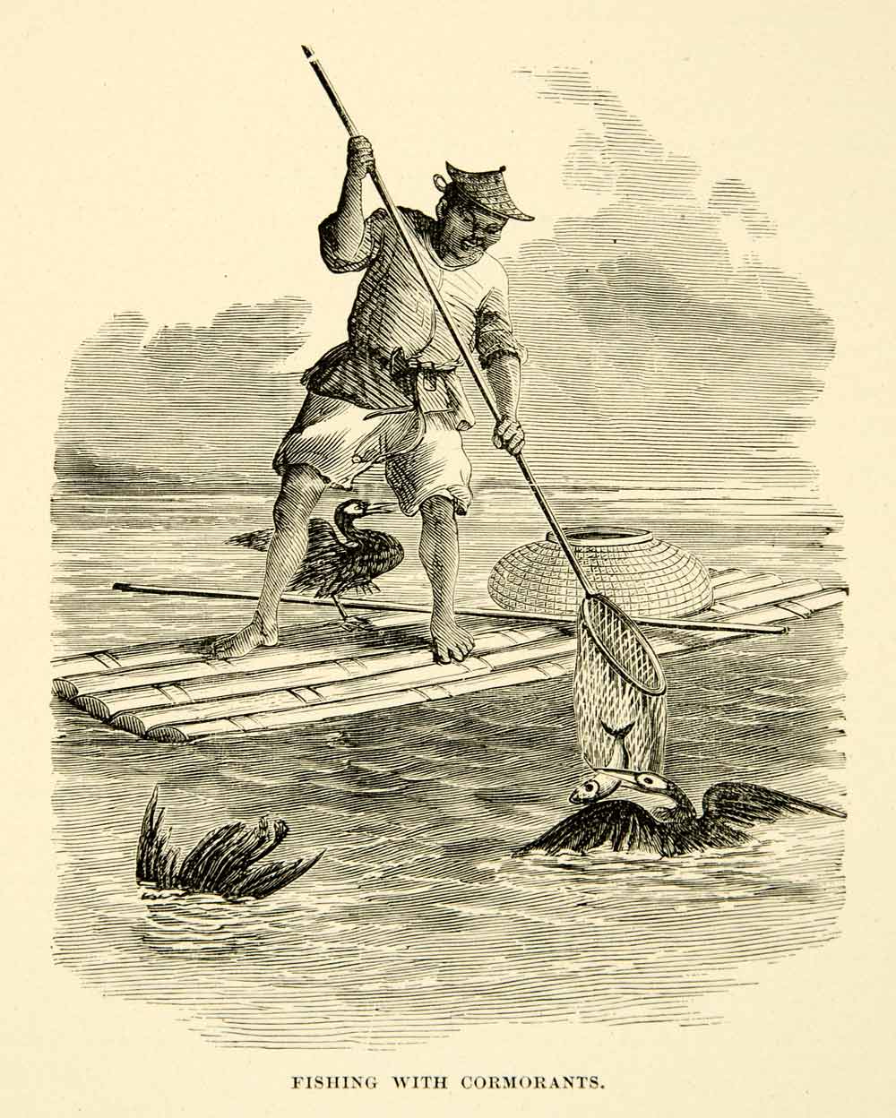 This is an original 1902 black and white in-text wood engraving that depicts a Chinese fisherman using cormorants in a traditional way to catch fish. Unfortunately, modern fishing methods have caused the steady decline of this traditional way of life.