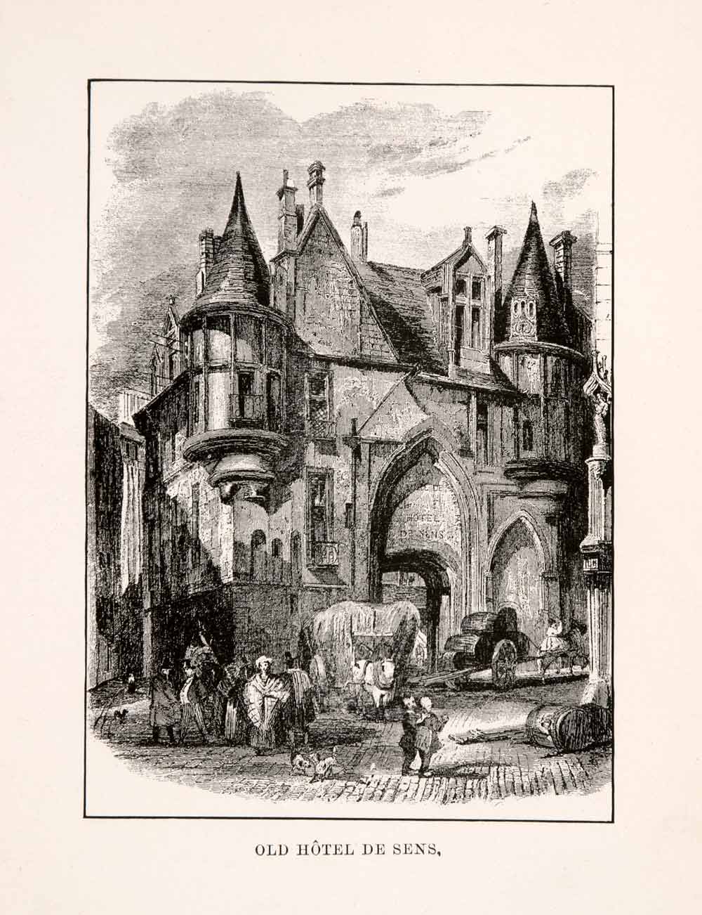 This is an original 1902 black and white wood engraving of the old Hotel de Sens in Paris, France.