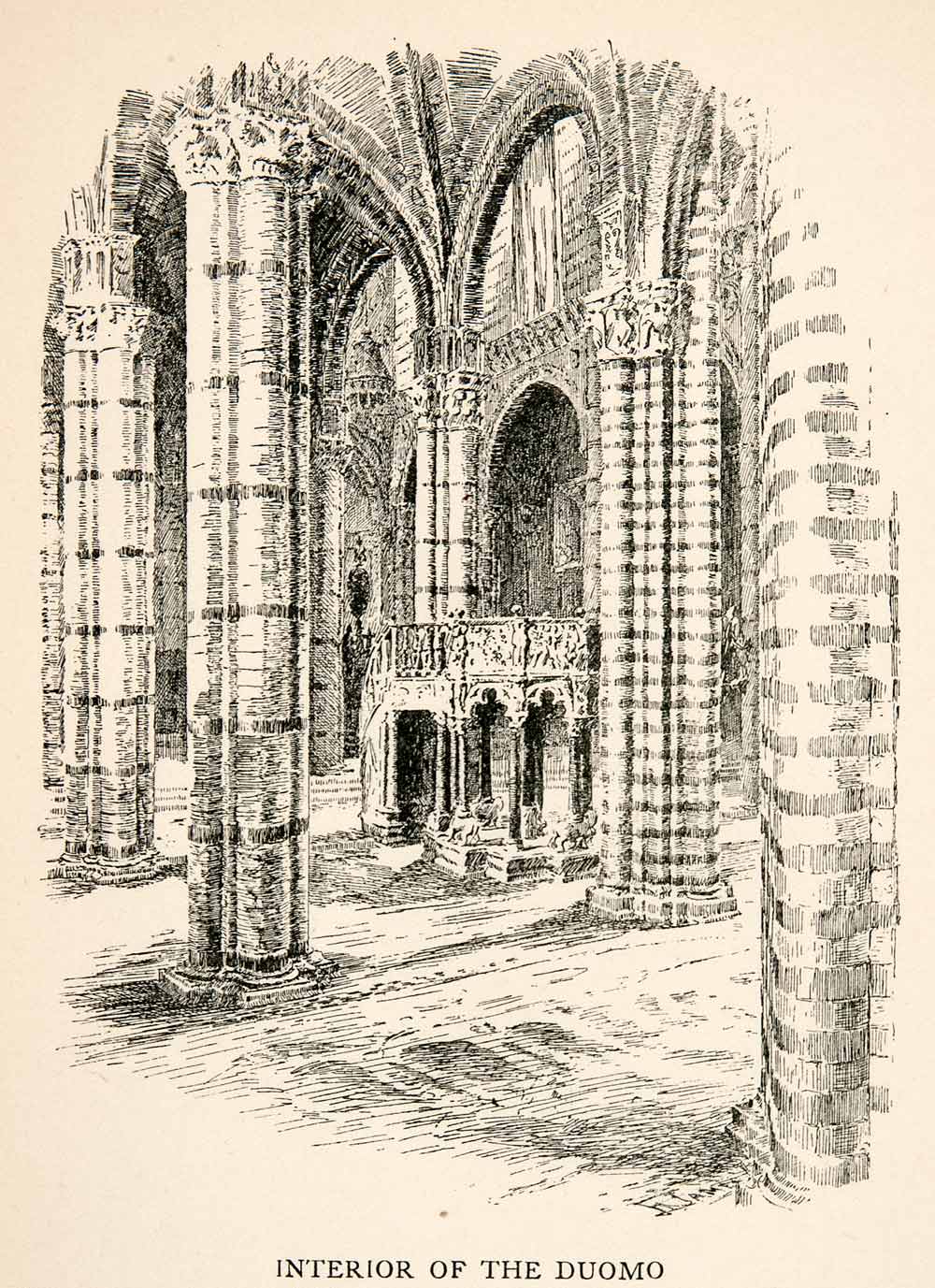 This is an original 1902 black and white wood engraving of the interior of the Cathedral (Duomo) of Siena, Italy.
