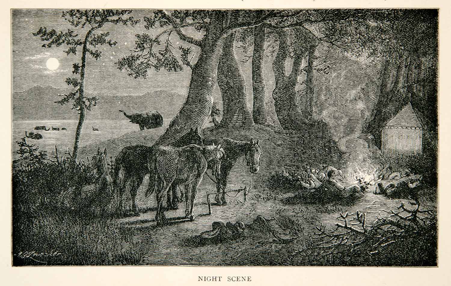 This is an original 1902 black and white wood engraving that depicts a European encampment in Sri Lanka. While the horses attempt to get a little shut-eye, nearby elephants trumpet at the moon during the their midnight swim.