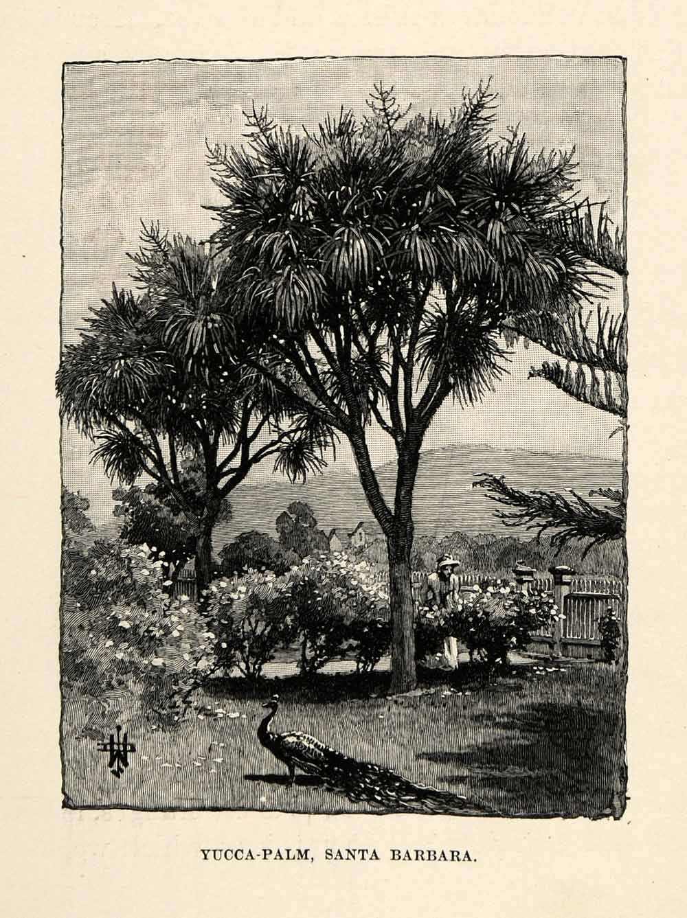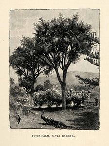 This is an original 1902 black and white in-text wood engraving of a Yucca-Palm tree is Santa Barbara, California, USA.
