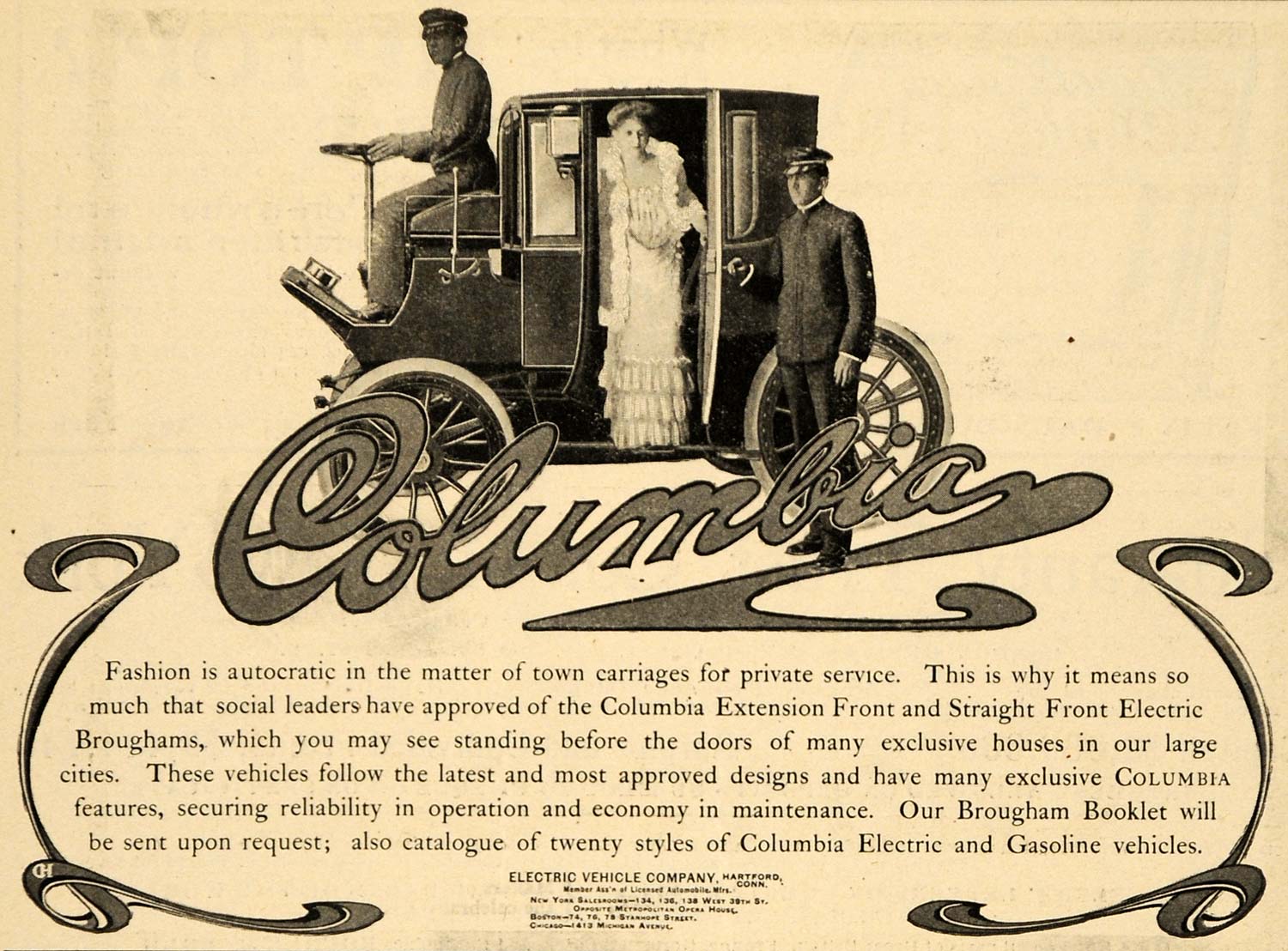 This is an original 1903 black and white print ad for Columbia electric and gasoline vehicles. The ad writes, "Fashion is autocratic in the matter of town carriages for private service."