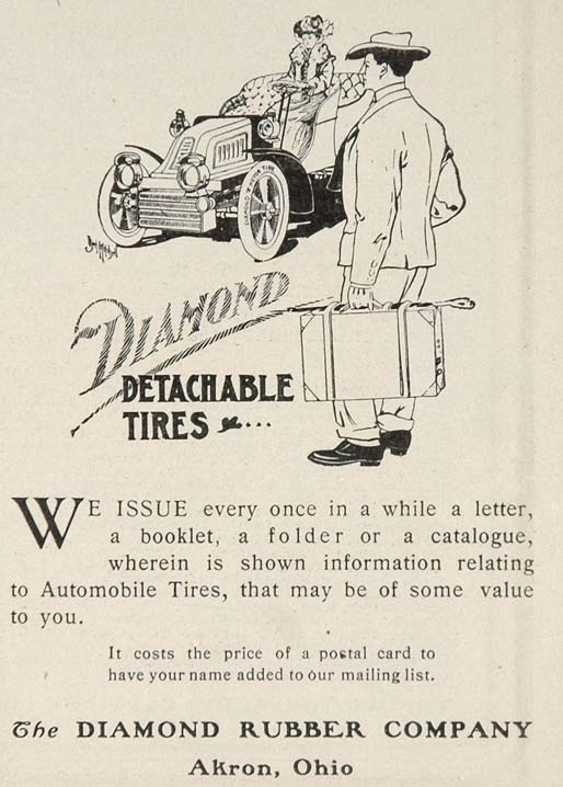 This is an original 1903 black and white print ad for Diamond Detachable Car Tires from The Diamond Rubber Company, Akron, Ohio.
